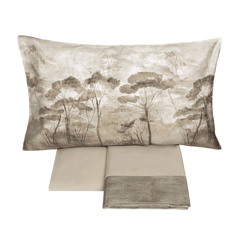 Le atmosfere mitologiche dei boschi abitati da ninfe e spiriti sacri hanno ispirato la collezione NEMORA. Il disegno, che rivela una texture mossa appena percettibile ripresa nella balza del lenzuolo. Proposta nelle calde tonalità neutre o nei verdi di stagione, la collezione in prezioso raso invita a ritrovare il proprio benessere nella natura incontaminata.