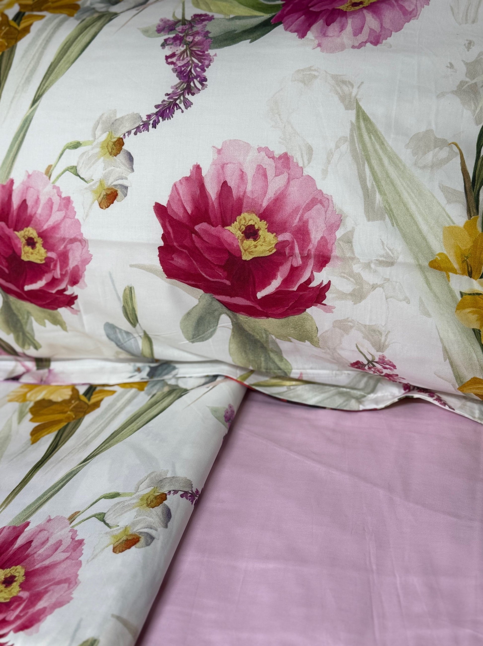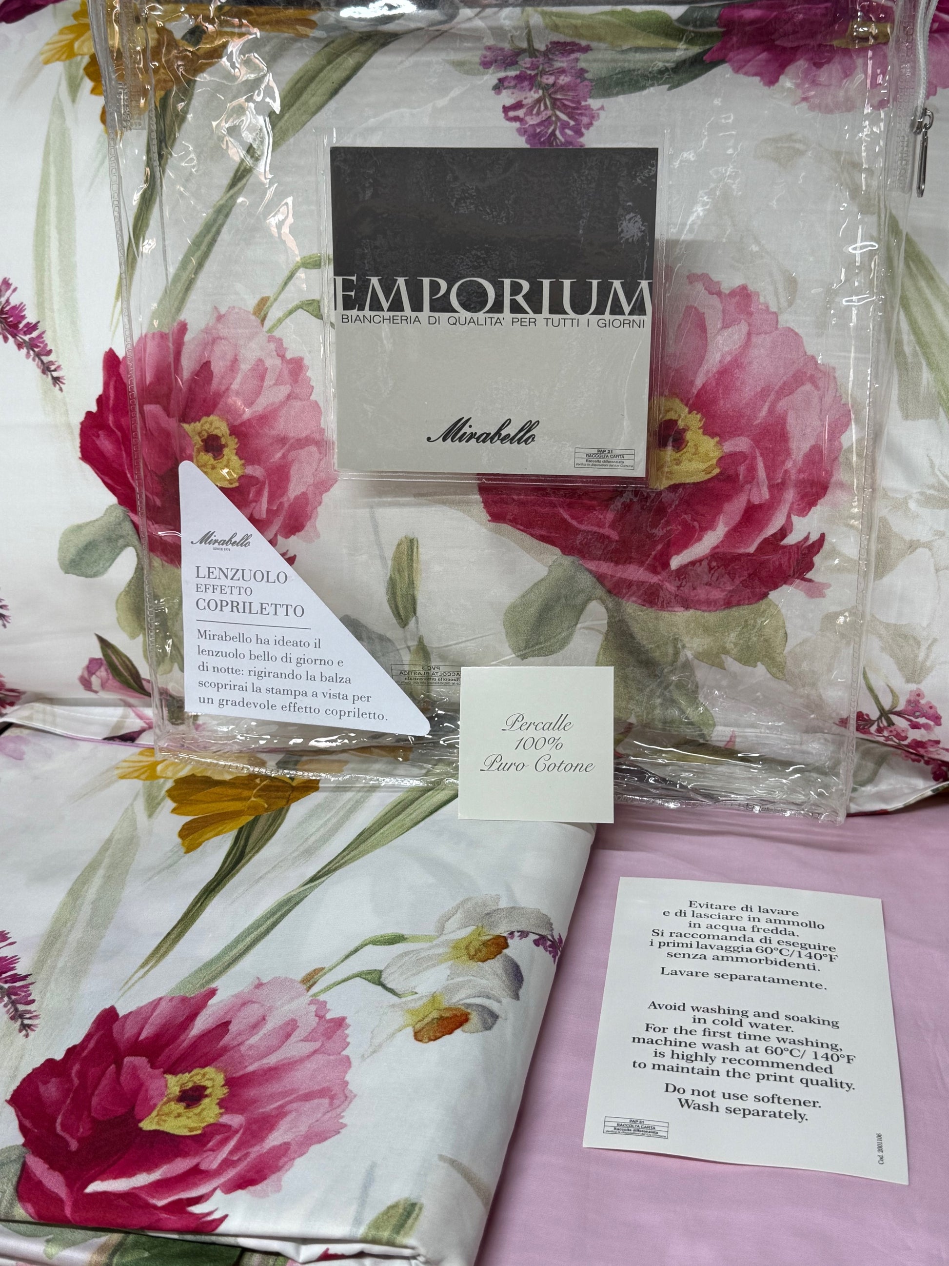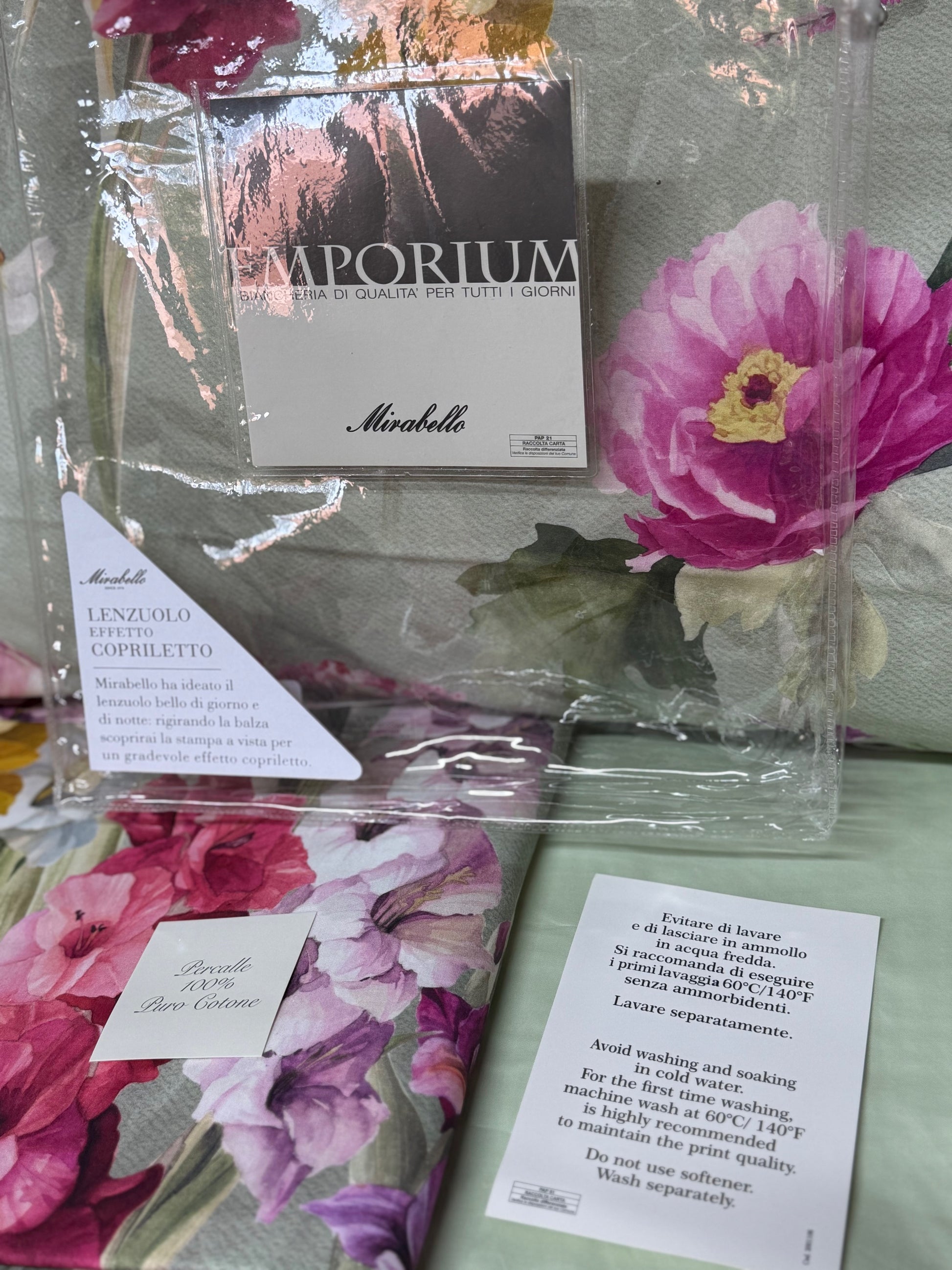 Mirabello Completo Lenzuola letto Due piazze in fine Percalle di Cotone, Effetto copriletto con Doppia Balza Art. Charming flowers