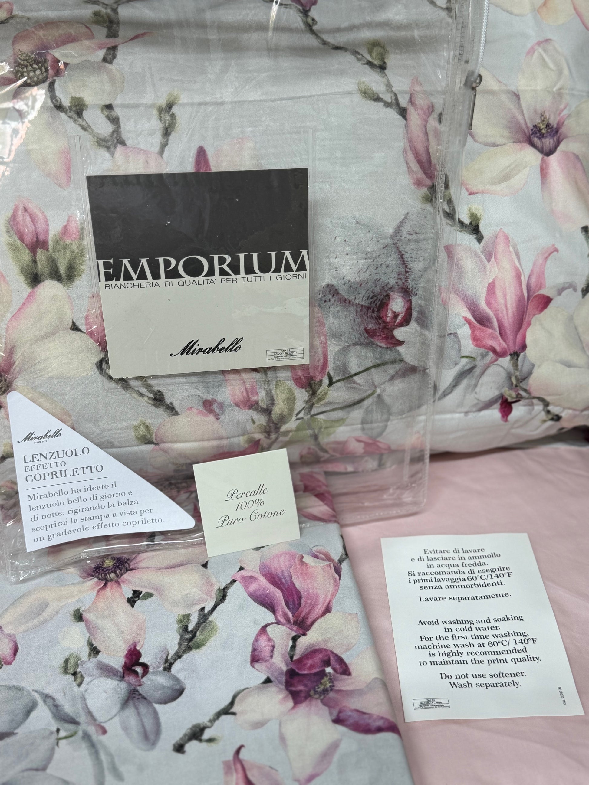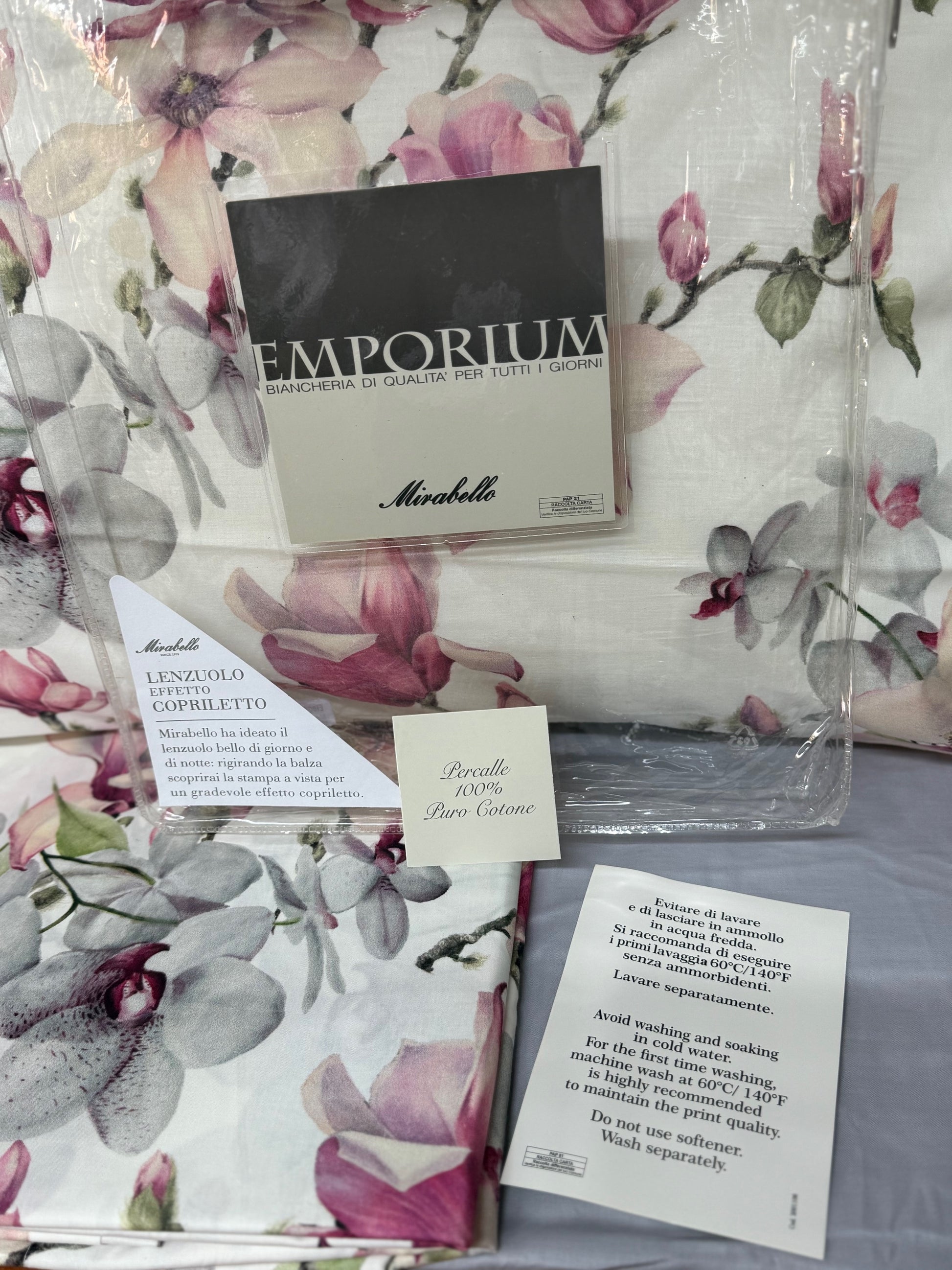 Mirabello Completo Lenzuola letto Due piazze in fine Percalle di Cotone, Effetto copriletto con Doppia Balza Art. Elegant Flowers