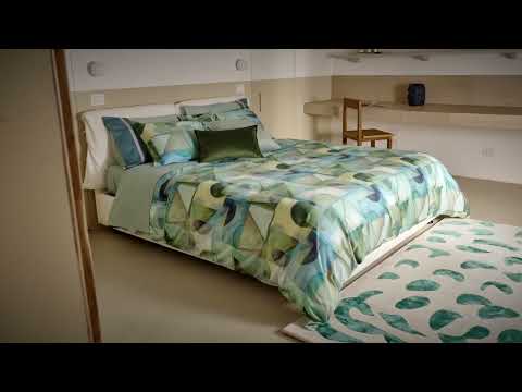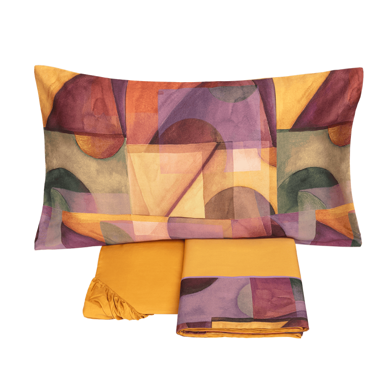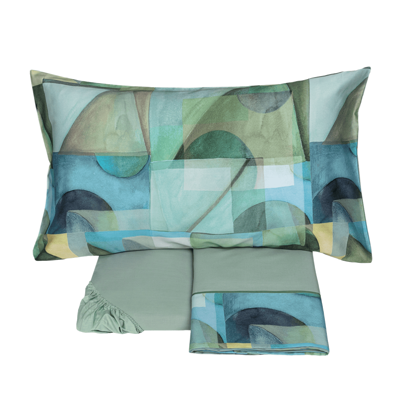 Le federe e l'alta balza del lenzuolo, impreziosita da codina a contrasto, sono in percalle di puro cotone stampato in digitale. Il resto del completo è in percalle di puro cotone tinta unita