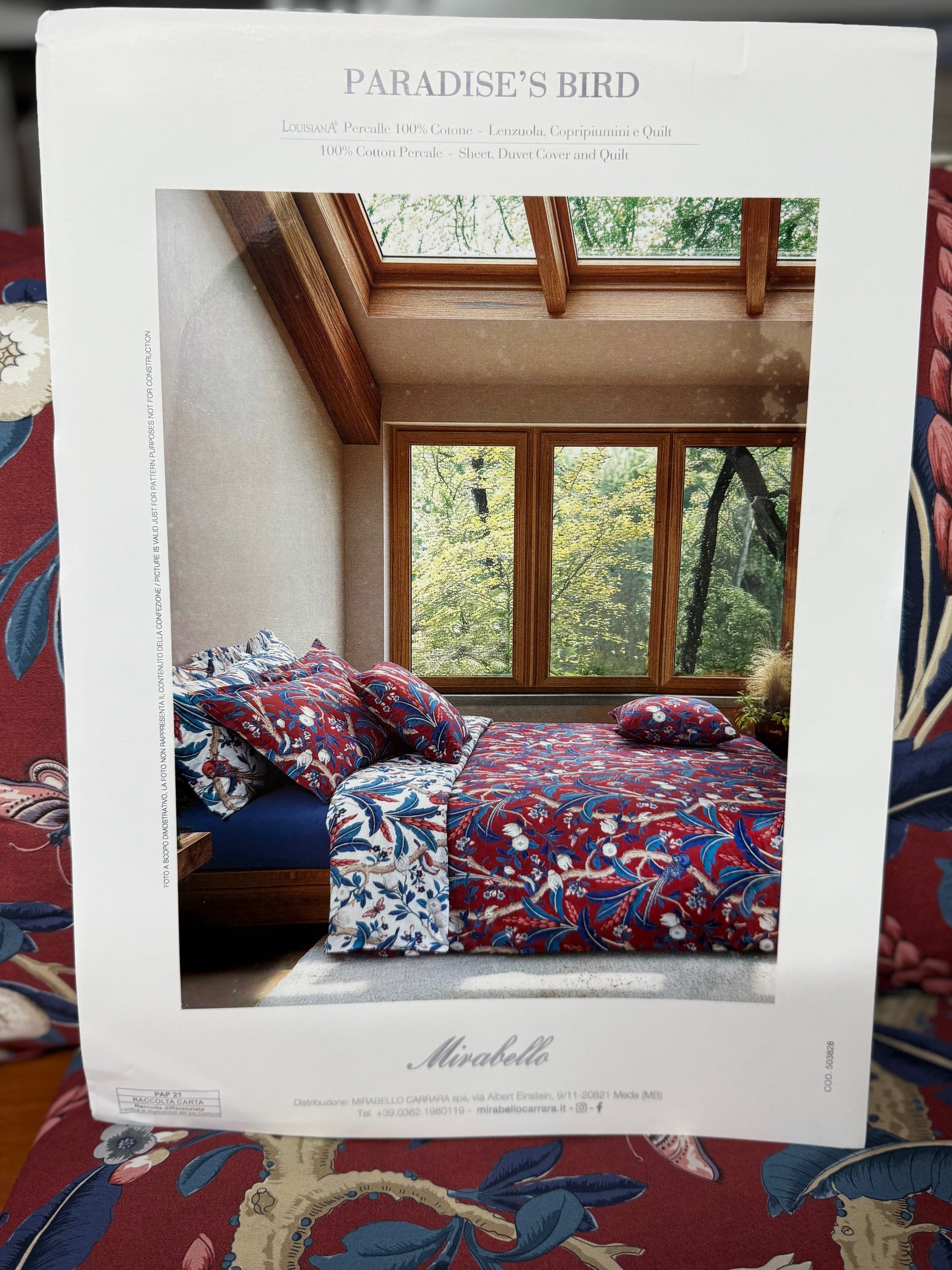 Mirabello ha ideato il celebre concetto del “lenzuolo bello di giorno e di notte”: rigirando la balza, la stampa diventa protagonista, trasformando il lenzuolo in un raffinato copriletto.