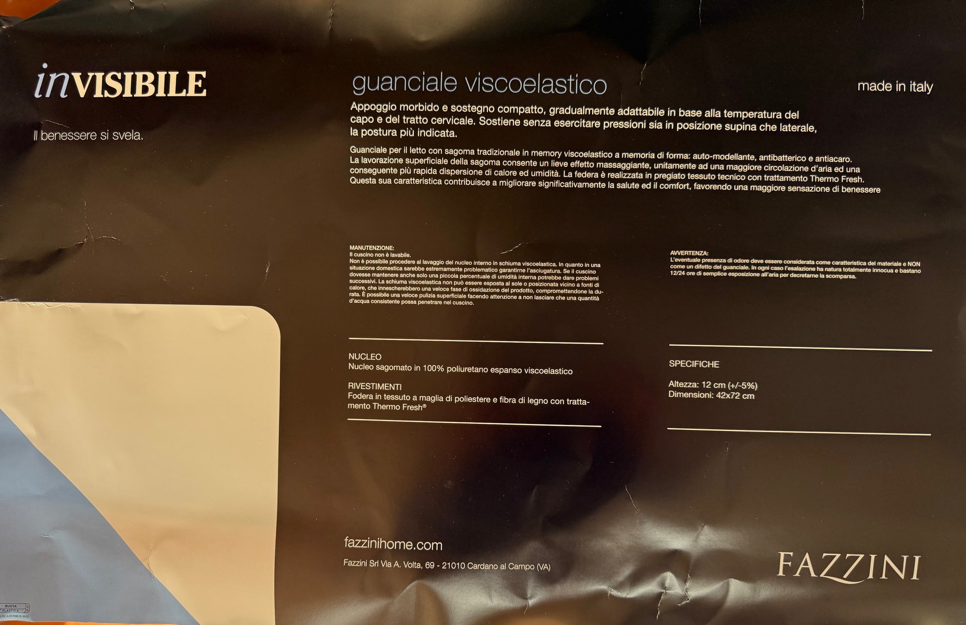 • Dimensioni ideali: cm 42x72 – altezza 12 cm (+/-5%), adatto a federe standard e perfetto per ogni posizione di riposo. Composizione: Federa: 53% Poliestere – 47% Tencel Sagoma interna: 100% Poliuretano espanso viscoelastico WaterlilyVE Facile manutenzione: rivestimento sfoderabile e lavabile, per una perfetta igiene nel tempo. Firmato Fazzini: sinonimo di qualità, comfort e attenzione al benessere del sonno.