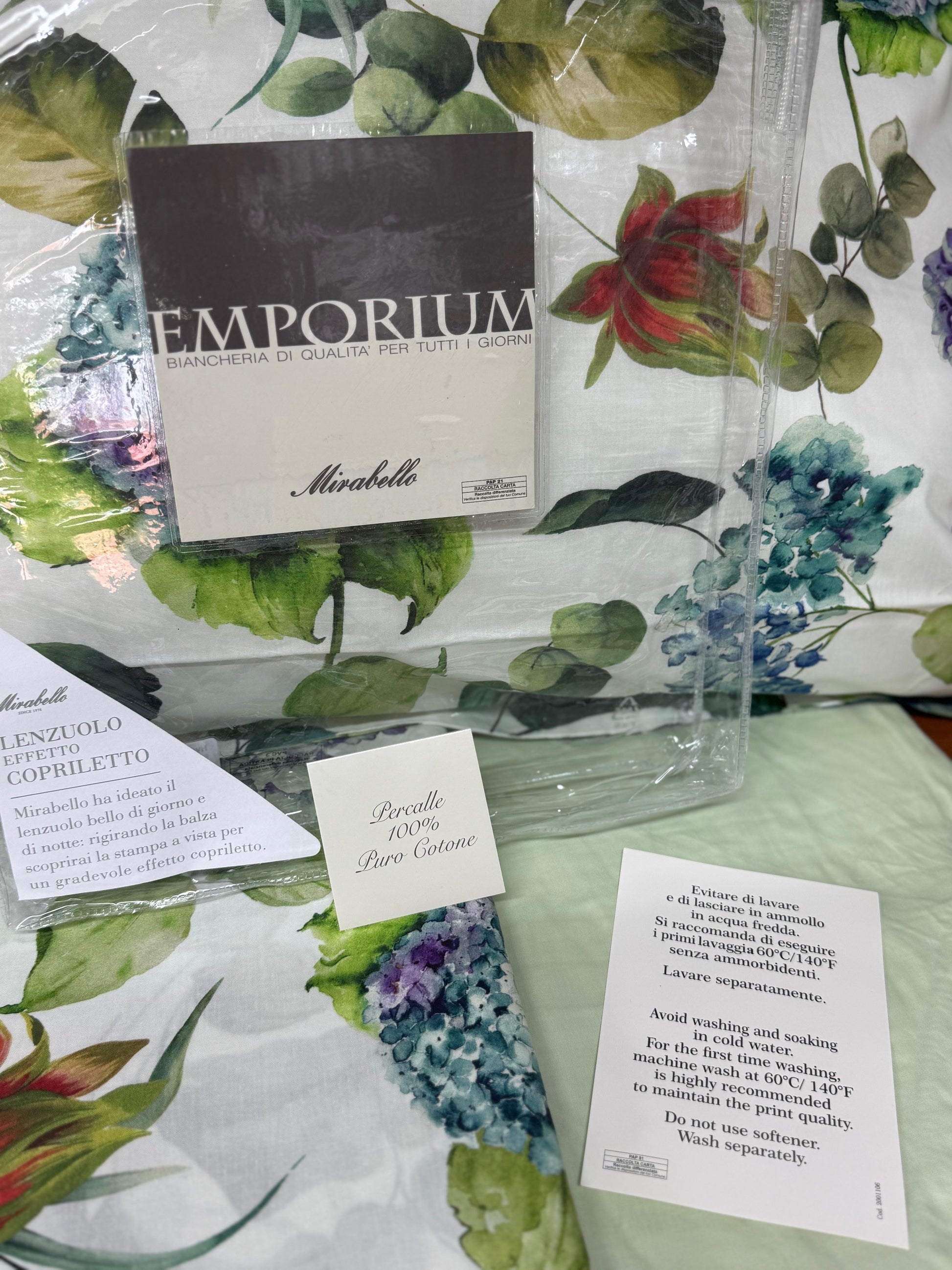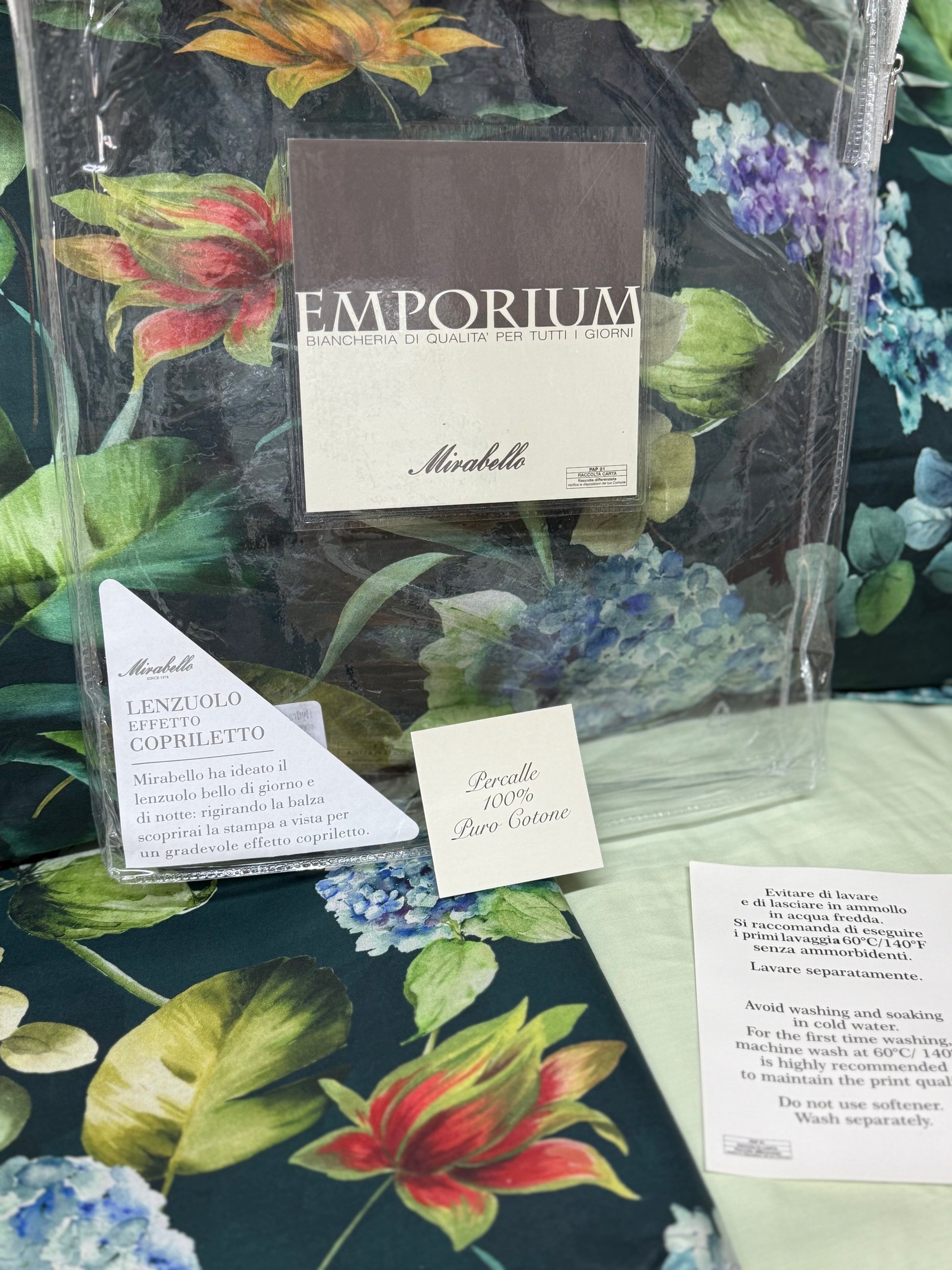 Mirabello Completo Lenzuola letto Due piazze in fine Percalle di Cotone, Effetto copriletto con Doppia Balza Art. Hydrangea Jungle